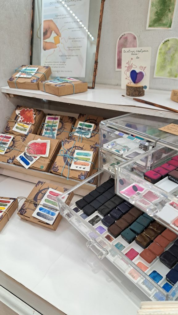 J’ai donc allié ma passion pour les couleurs à mon envie de créer des aquarelles uniques et de belle qualité, aux teintes inspirantes. La combinaison choisie est végane, c’est-à-dire qu’elle ne contient aucun produit d’origine animale. Je sélectionne soigneusement chaque pigment, et je réalise un broyage minutieux, ce qui me permet de proposer une peinture extrafine, crémeuse et agréable à travailler.